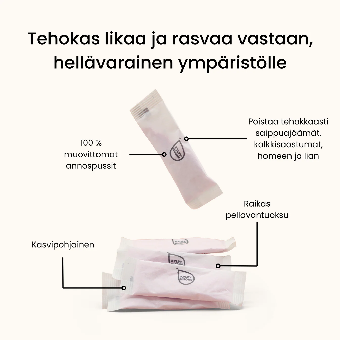 Käyttöohje: Sekoita pesuainepussi kylmään veteen kestopullossa. Ravista ja käytä normaalin kylpyhuoneen puhdistusaineen tapaan.
